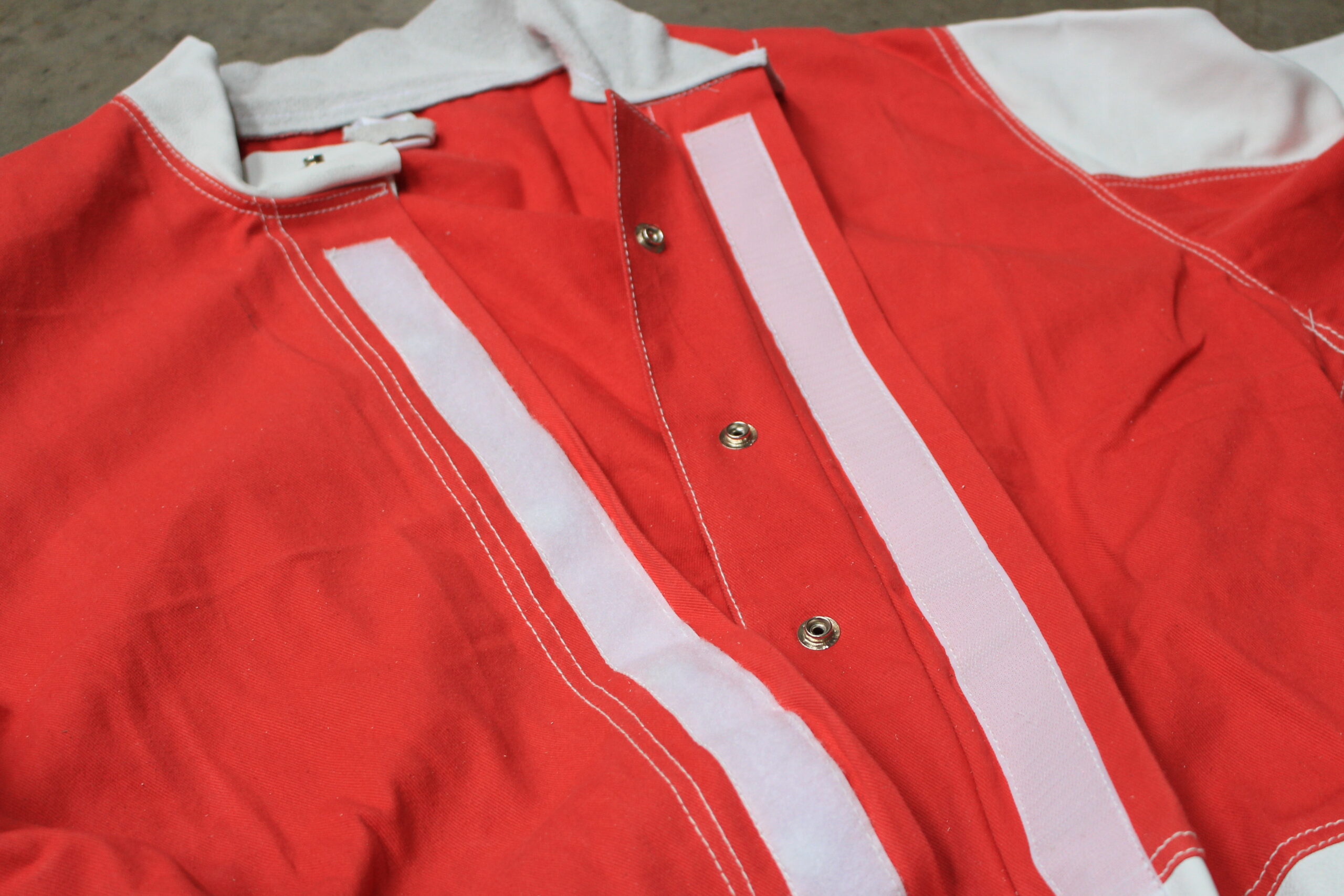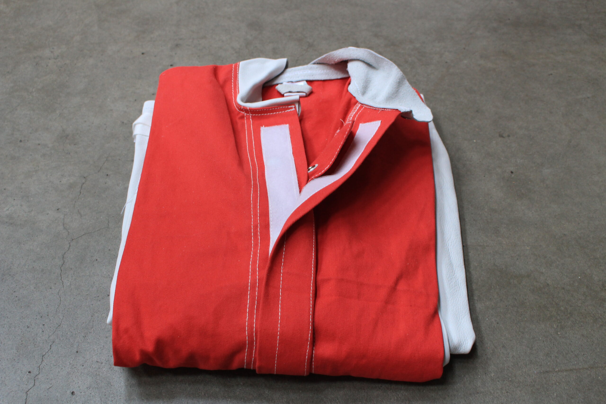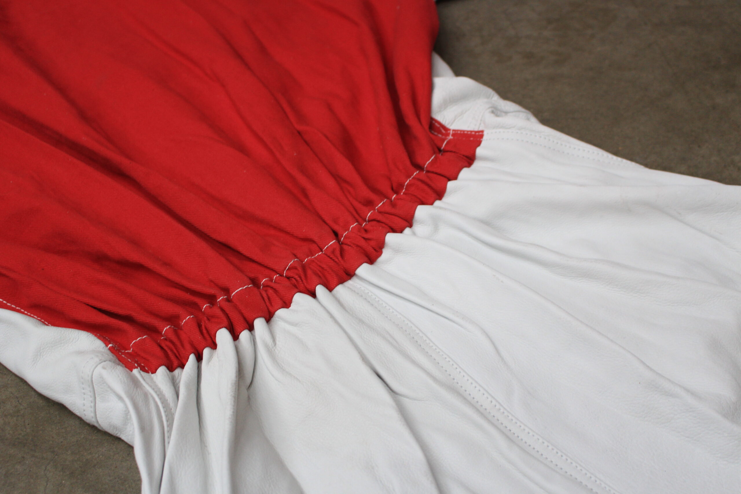 Leichter Strahlanzug für Sandstrahlarbeiten unterschiedlicher Art: Kombination aus kräftigem Vollrindleder und rotem Baumwollgewebe im kompletten hinteren und vorderen Brustbereich.