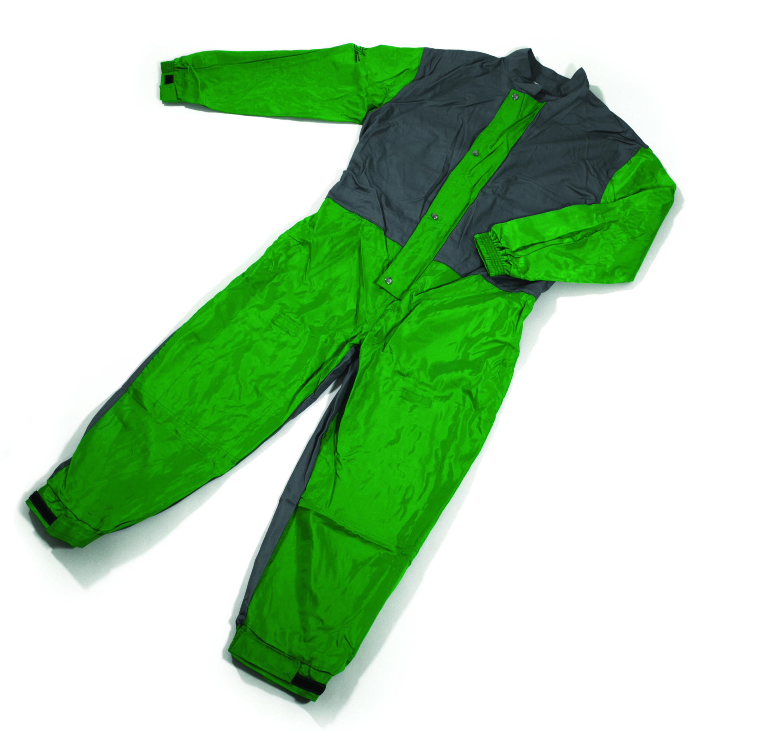 1-teiliger Overall mit Gummizug im hinteren Hüftbereich und doppeltem Verschluss (innen mit Druckknöpfen, außen mit Klettverschluss) auf der Vorderseite. Die Ärmel- und Hosenbein-Enden lassen sich durch Schlaufen verstellen.